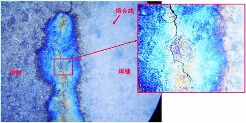 接管與筒體接頭焊后進行的MT、UT和RT檢測未發現缺陷,而熱處理MT檢測發現缺陷,在接管與筒體焊縫內壁熔合線區域有多處線性顯示,長度均在20~30mm。對其中某個MT顯示區域進行PT檢測,檢查發現線狀顯示,PT與MT顯示位置基本重合。對PT顯示區域進行現場金相觀察,在拋光腐蝕后可肉眼觀察到位于焊縫熔合線處有細長裂紋存在,長度約20mm。對裂紋進行金相觀察,通過顯微鏡發現裂紋位于焊縫熔合線上,裂紋細長,如圖1所示。